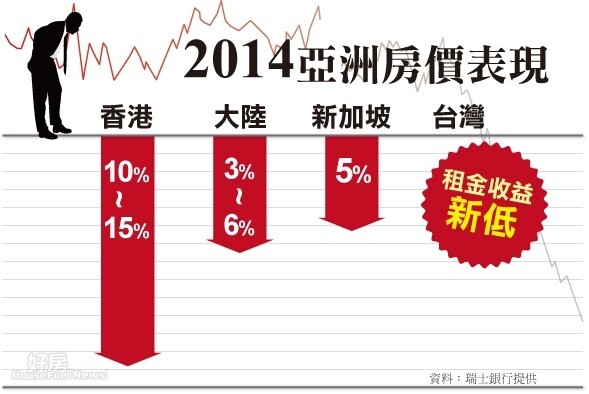 瑞士銀行舉辦一場「2014年度展望媒體說明會」,瑞銀財富管理亞太區首席投資總監浦永灝表示,除了日本以外、全亞洲的房地產都有泡沫問題,估計香港和新加坡的住宅價格,恐怕會跌至15%和6%,雖然2014年亞洲房價大幅修正的可能性不大,但台北台北租金報酬率在全球敬陪末座僅逾1%,投資台北房地產應謹慎。