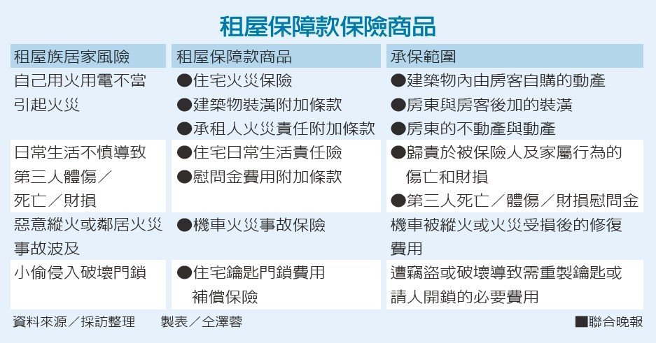 目前市面上多數住宅火險是保障屋主本身或房東,但包括新安東京海上、台產、富邦、和泰、泰安、明台、旺旺友聯、新光產、華南等保險公司,均有推出「承租人火災責任附加條款」單項商品。