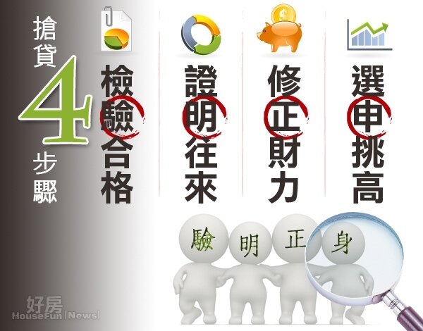 接下來四大法則的步驟二及步驟三則是重要關鍵,步驟二的【證明來往】則是找出適合的2到3家銀行,最好把自己、家庭的存款、信用卡或是所有金融相關業務,都選擇在該銀行進行,至於步驟三則是【修正財力】,最好買屋的前3個月,就要把自己或家庭的存款集中,甚至連親友的也在考量之內,甚至不排除向父母或兄弟姐妹周轉,將預計繳納之房貸6個月或12個月之金額存入,最後一個步驟則是【選申挑高】,因為銀行會以工作狀況、職業公司、收入穩定為重要考量,所以,建議以收入較高或任職公司知名度高的一方為借款申請人尤佳。