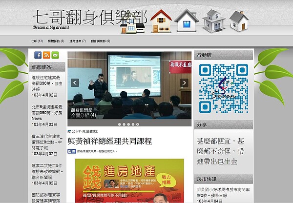 打出以炒房翻身致富的「翻身俱樂部」不僅有官網,還有FB粉絲團,號稱能以最低價買到尚未公開的預售屋。(翻攝自七哥翻身俱樂部官網)